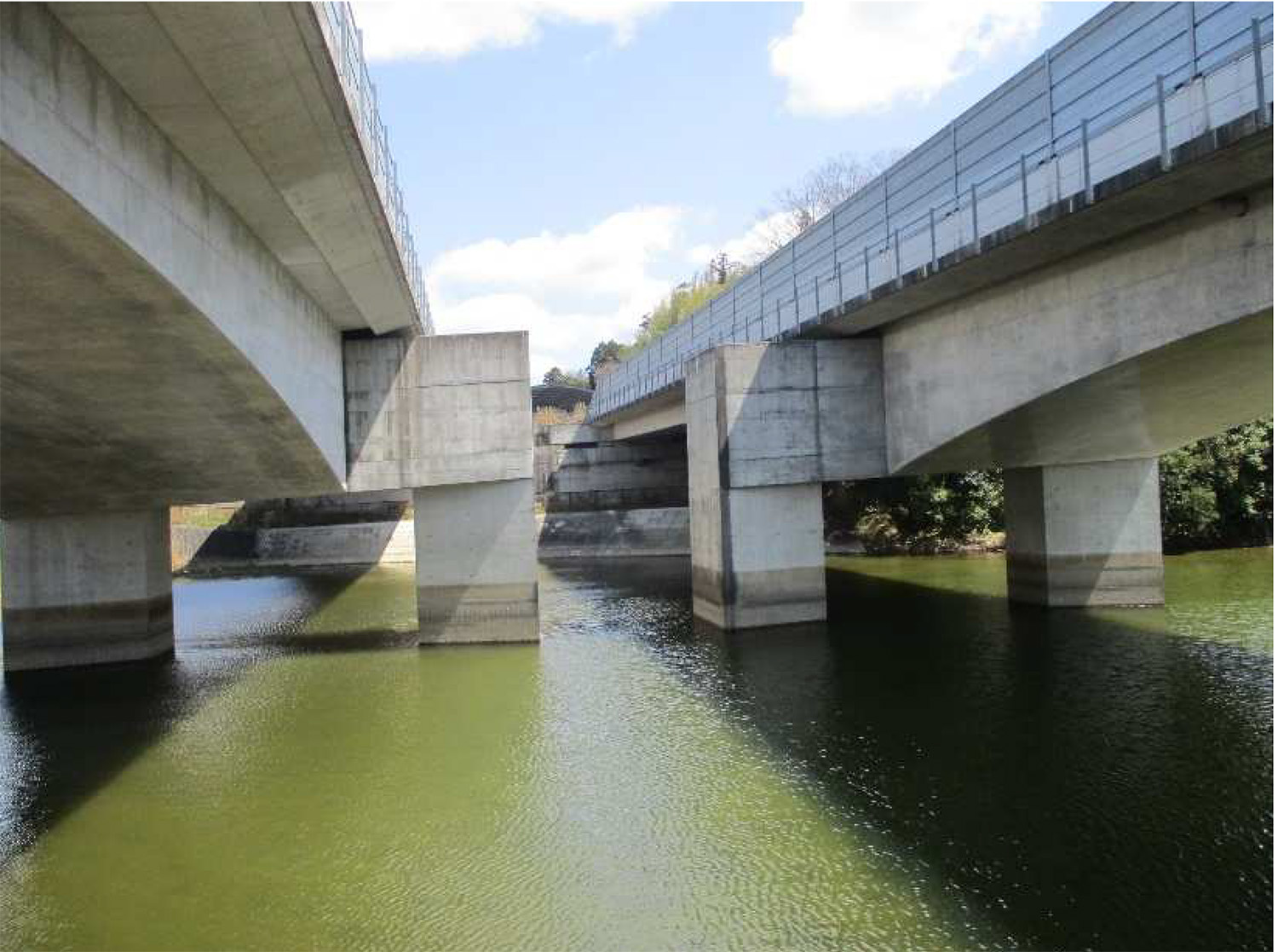 大城 もうひとつ事例をあげますと、池の中に門型のRC橋脚があり、そこに剛結されているPC箱桁があります。