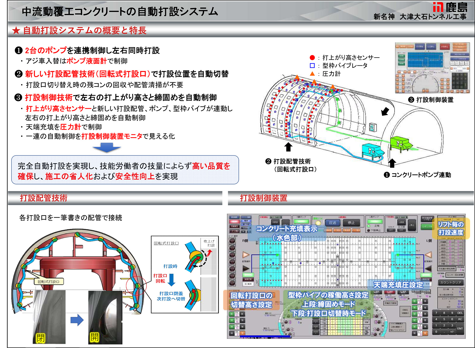 宮内 鹿島建設の技術を用いています。現場では吹上方式で覆工コンクリートを打設していきますが。押し上げる時に、最初の打設口に下からコンクリートを打設してある高さまできたら、打設口を閉めつつ、その部分にある球体を回転させて、次の打設口までの配管を形成して、それを繰り返し連続作業で進めていきます。